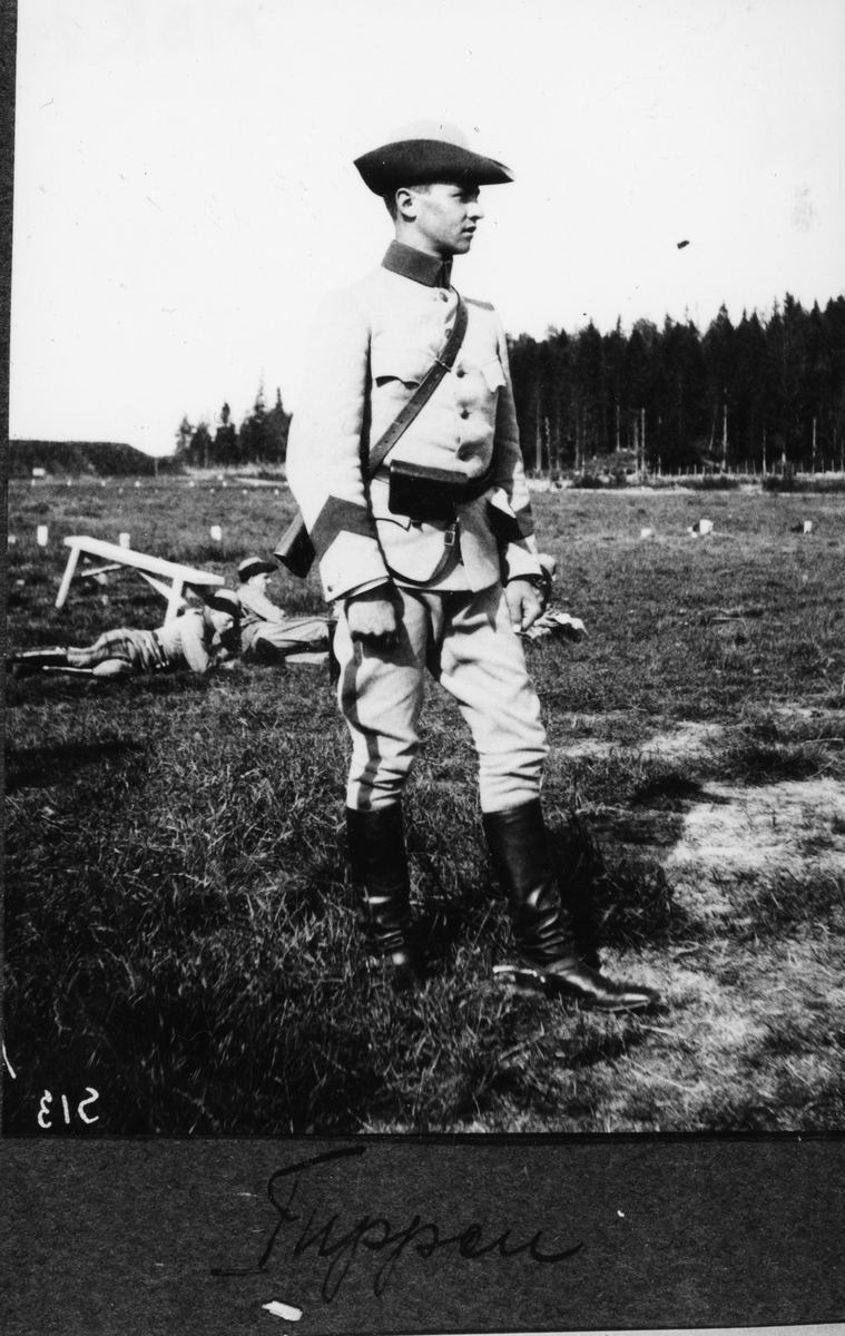 Soldat klädd i uniform m/1910 stående på stort fält, andra soldater ligger i bakgrunden. Fotot betitlat "Tuppen".