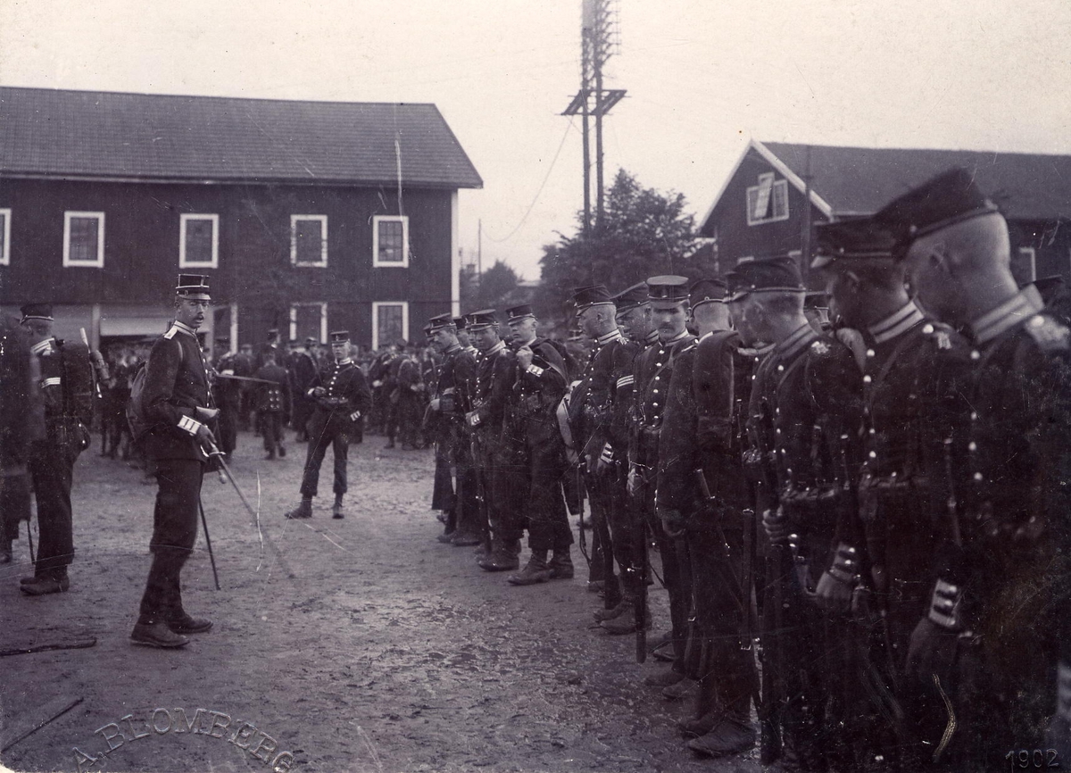 Svea livgarde I 1, lett av prins Gustaf ( VI ) Adolf, uppställt före marsch från Katrineholm, 1902. Soldaterna bär uniform m/1886 och är utrustade med gevär m/1896.