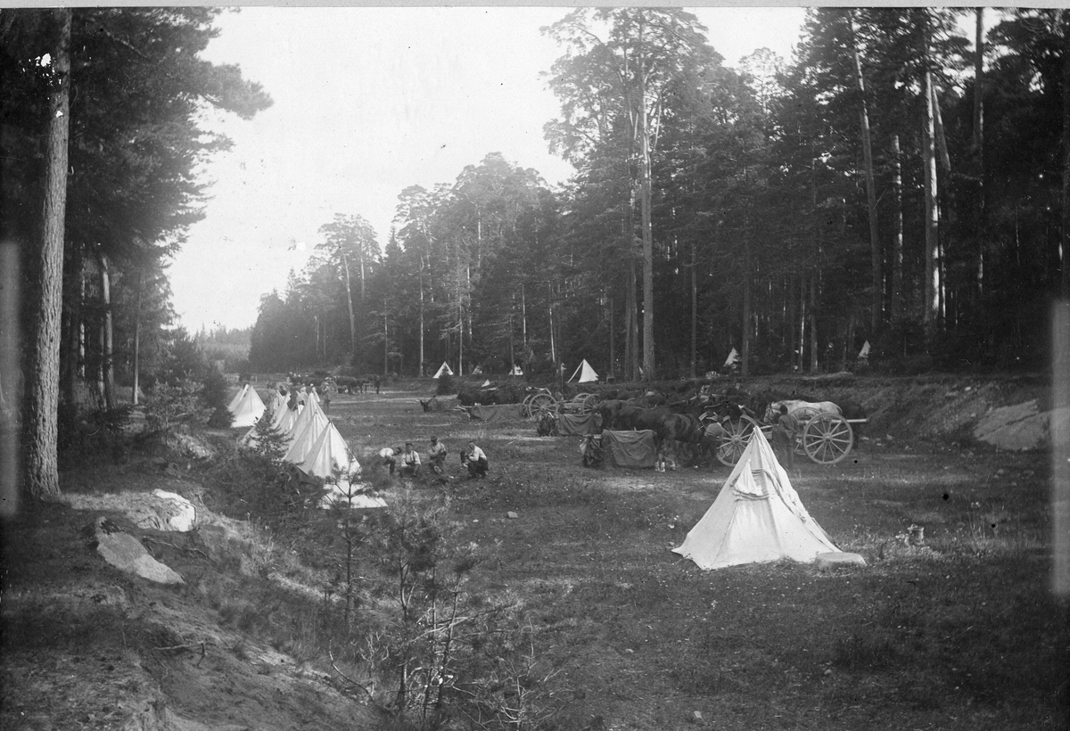 Läger med små tält, hästar och vagnar på brandgata i skog, Uppsala 1895.