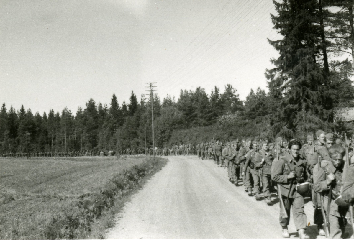 Titel: Soldater marsherar på landsvägen.