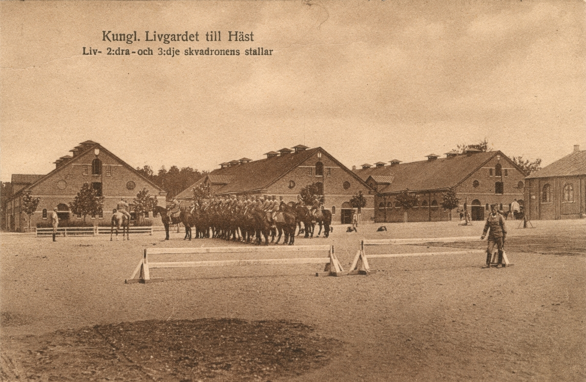 Titel: Beridna kavallerister från Livgardet till häst uppställda på kaserngården.