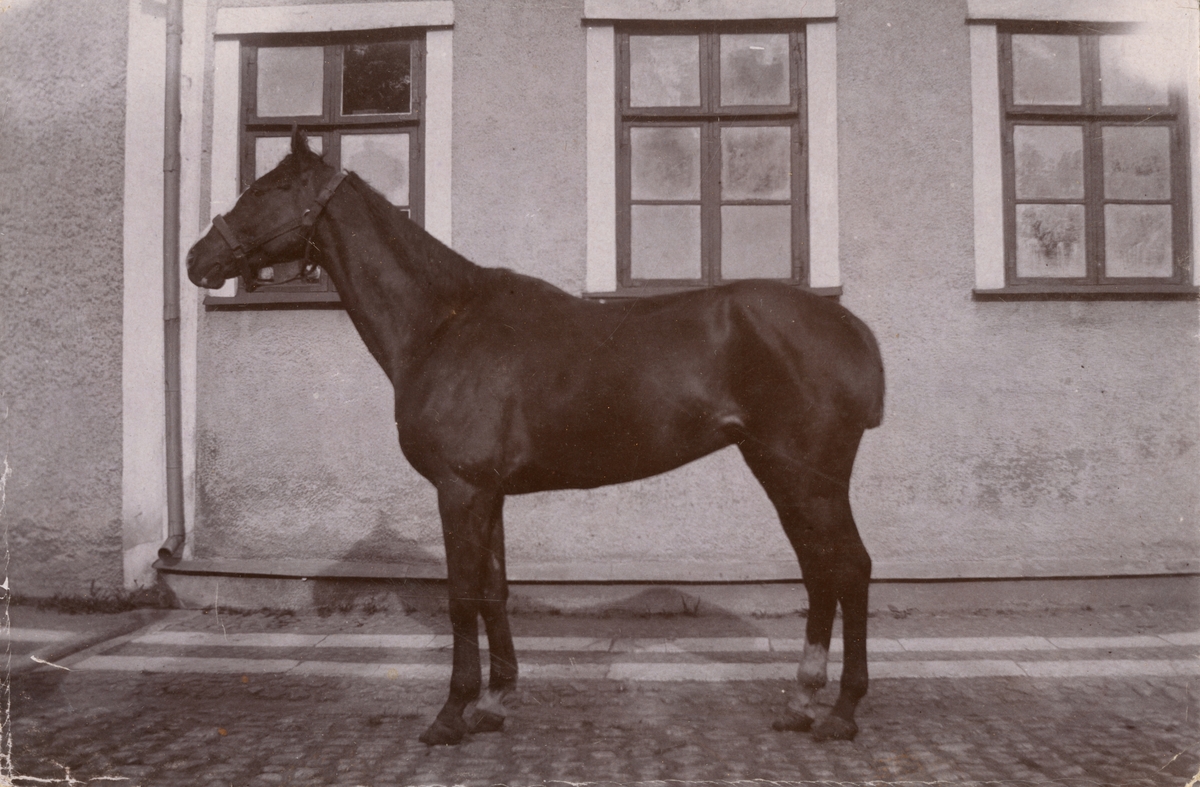 Häst utanför en byggnad, troligen Livregementets husarer K 3.
