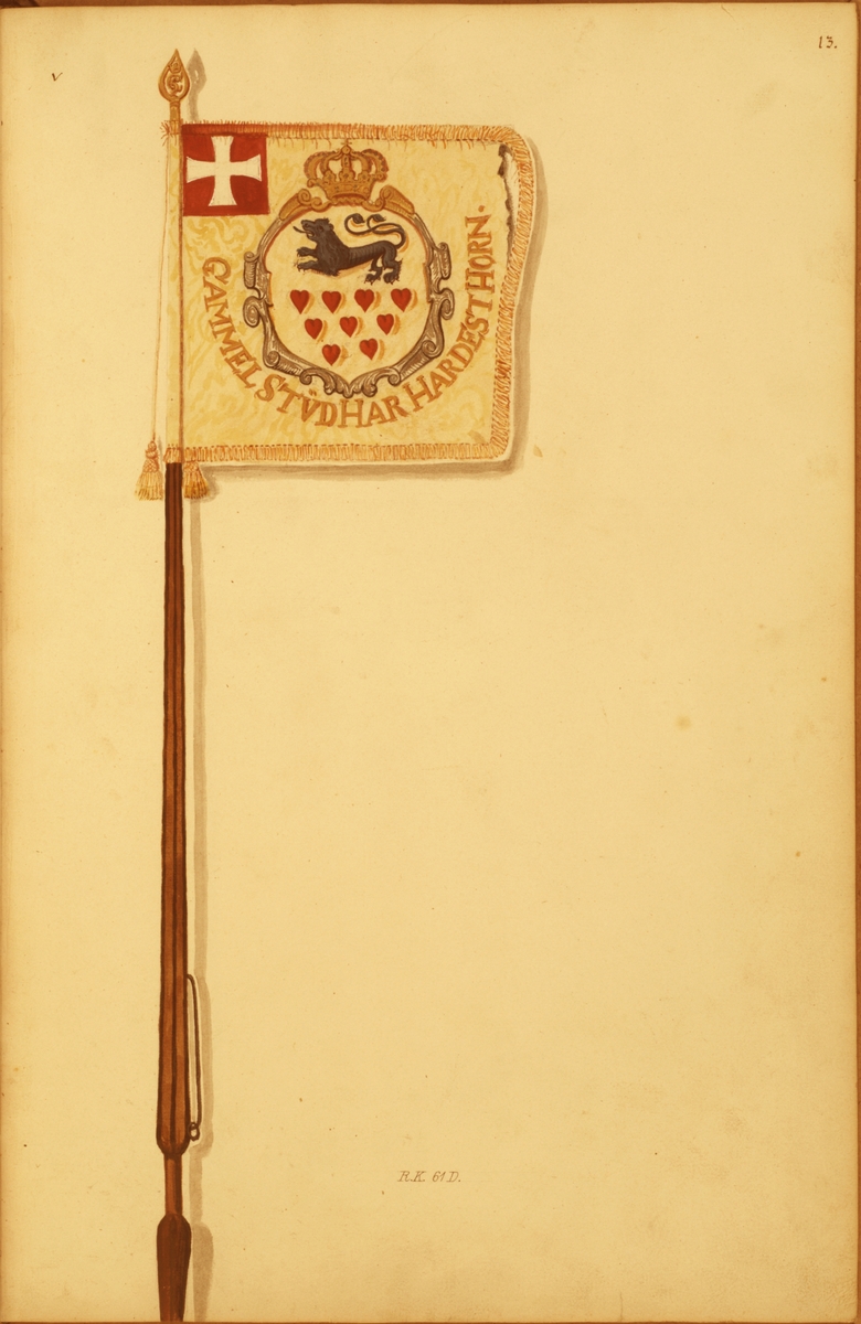Titel: Avbildning i gouache föreställande fälttecken taget som trofé av svenska armén. Det avbildade standaret finns inte bevarat i Armémuseums samling.
