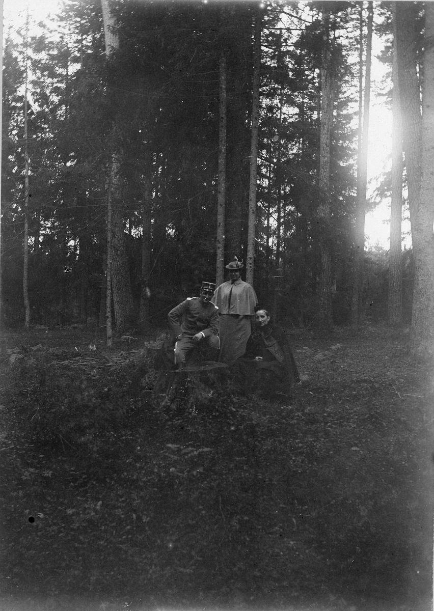 Soldat sittande på stubbe i skogen i sällskap med två kvinnor, Uppsala 1895.