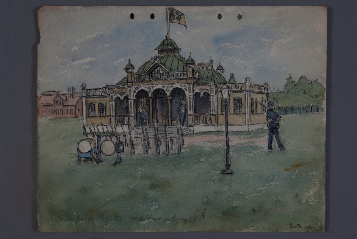 Plansch med Skaraborgs regementets vakthus i Axvall, ritad av Einar von Strokrich.