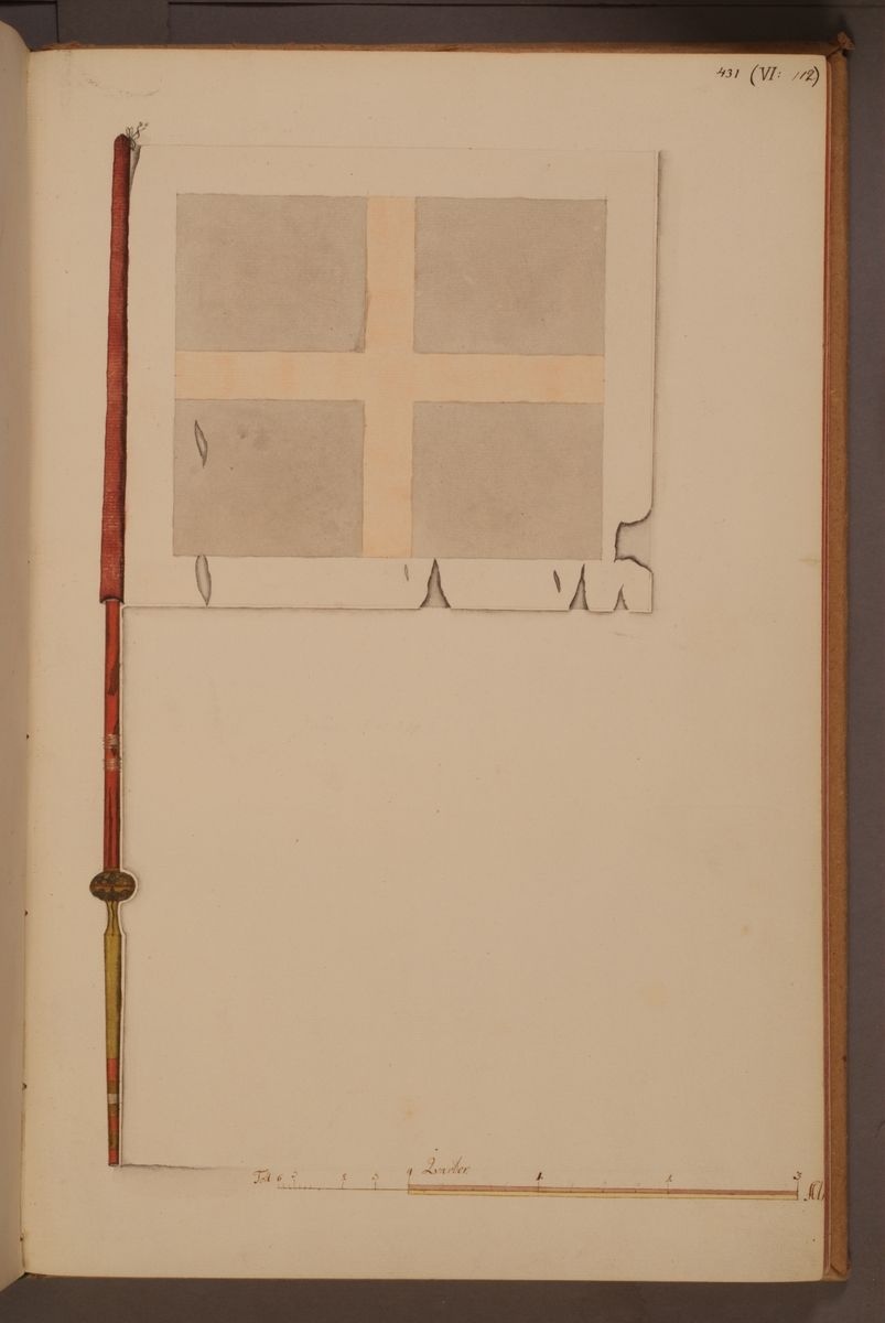 Titel: Avbildning i gouache föreställande fälttecken taget som trofé av svenska armén. Den avbildade fanan finns inte bevarad i Armémuseums samling.