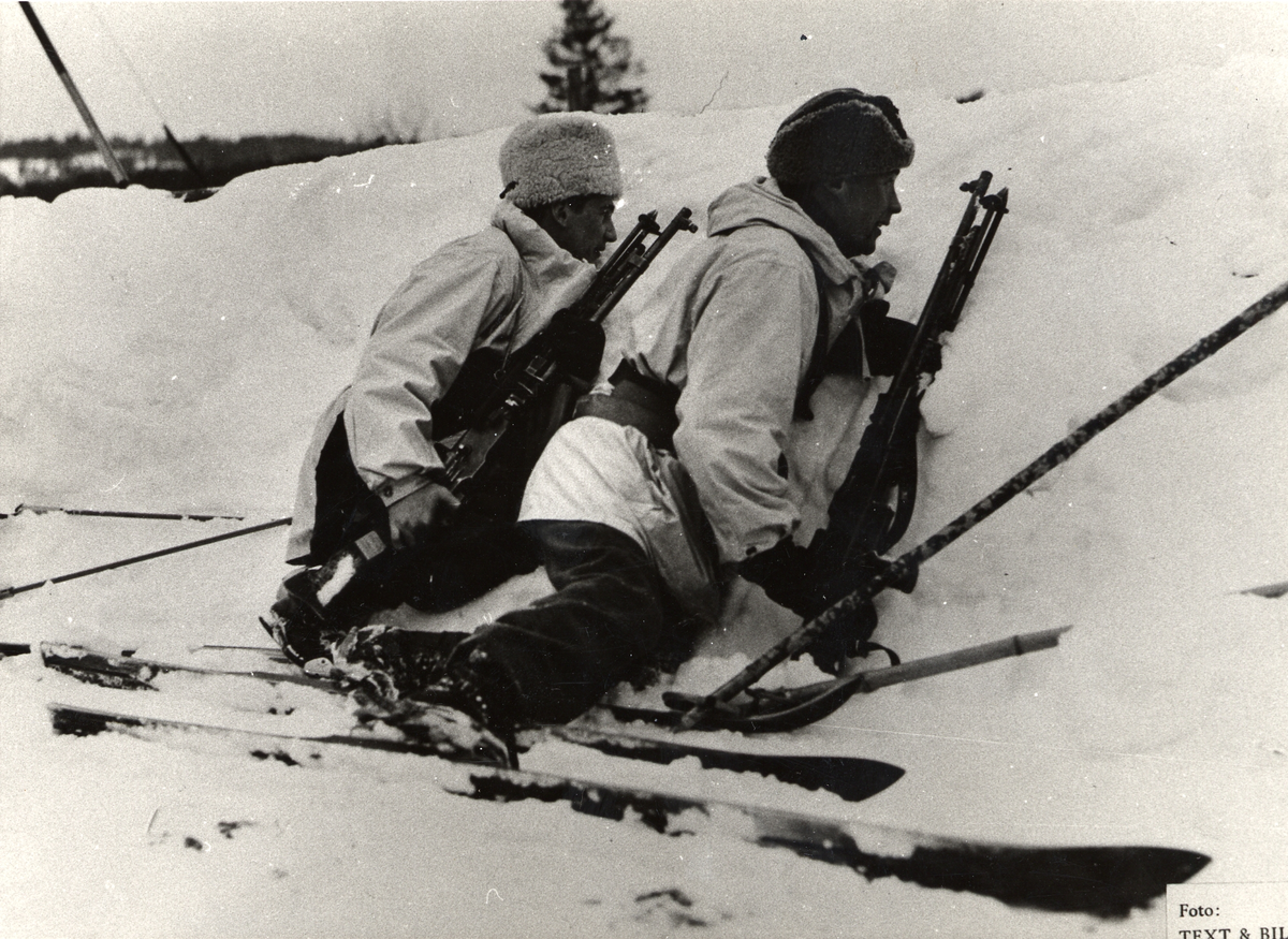 Titel: Två man med snödräkt och pälsmössa ligger och kikar över snövall med varsin kulsprutegevär m/1921.
