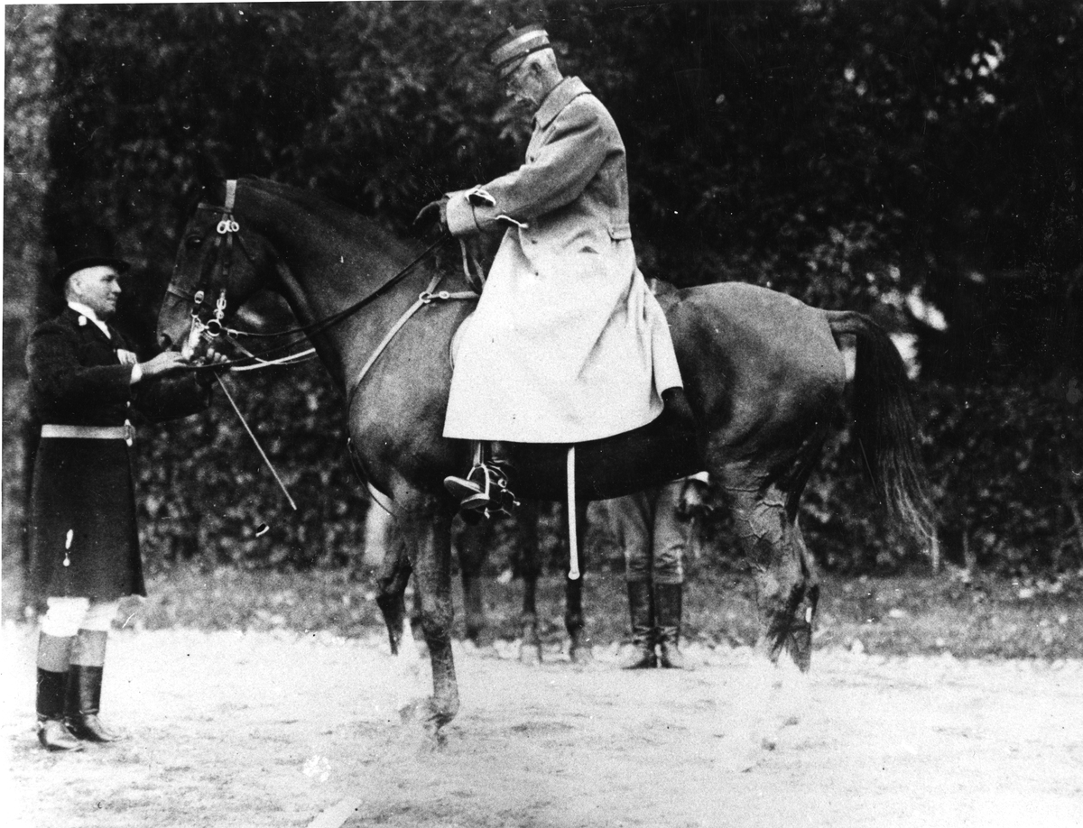 Kung Gustaf V sitter upp till häst hos Norrlands Dragonregemente K 8, 1927.