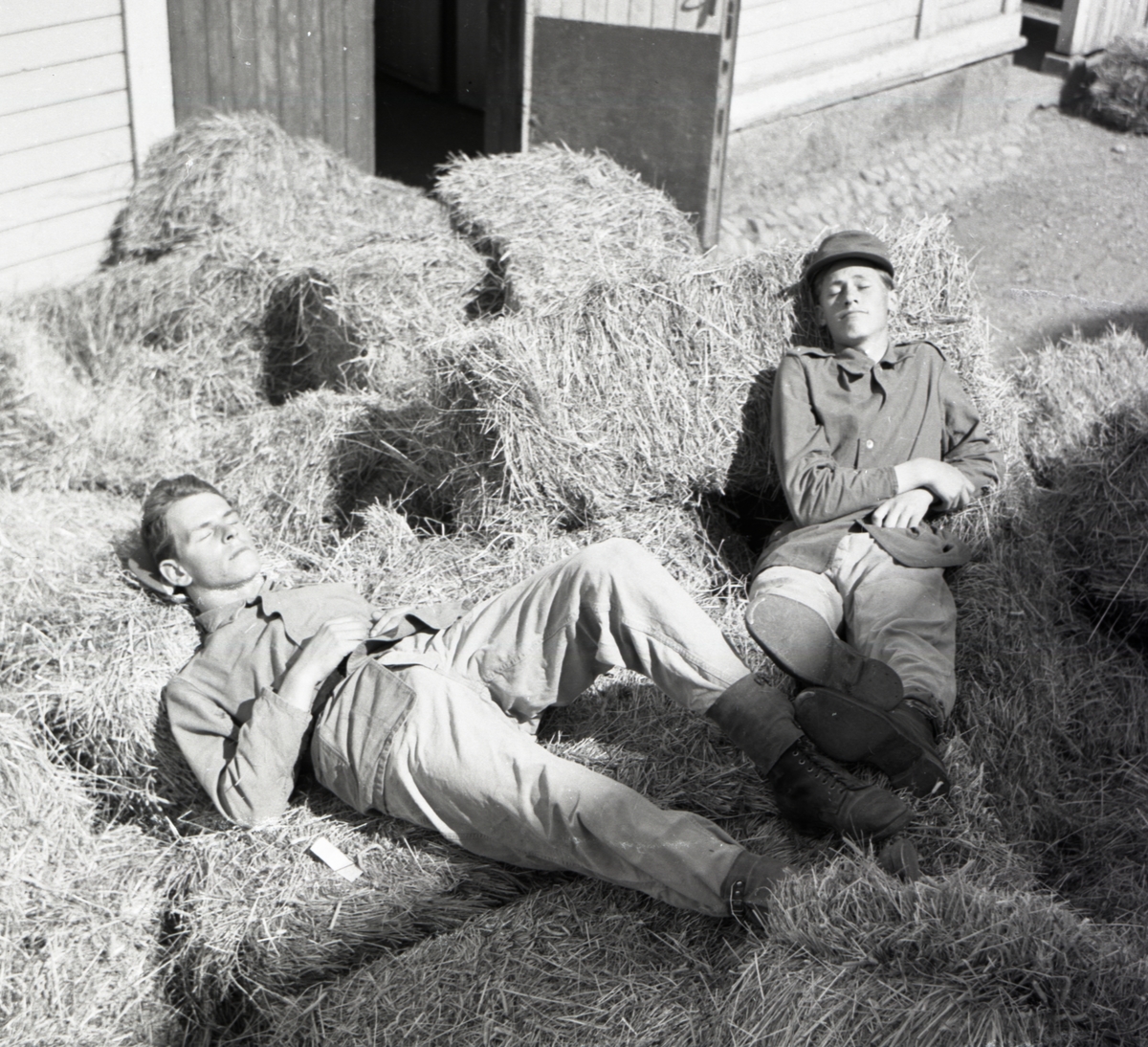Två värnpliktiga vilar på höbalar. Norrlands dragonregemente K4, Umeå, 1955-1956.