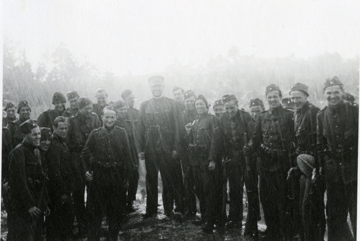Titel: Värnpliktiga uppställda ute i regnet.