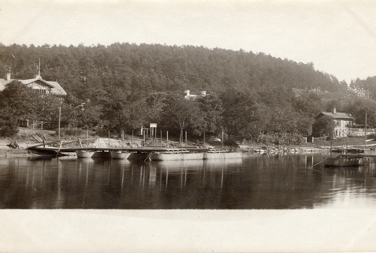 Titel: Vy över vattendrag med pontonbro. Brevkort.