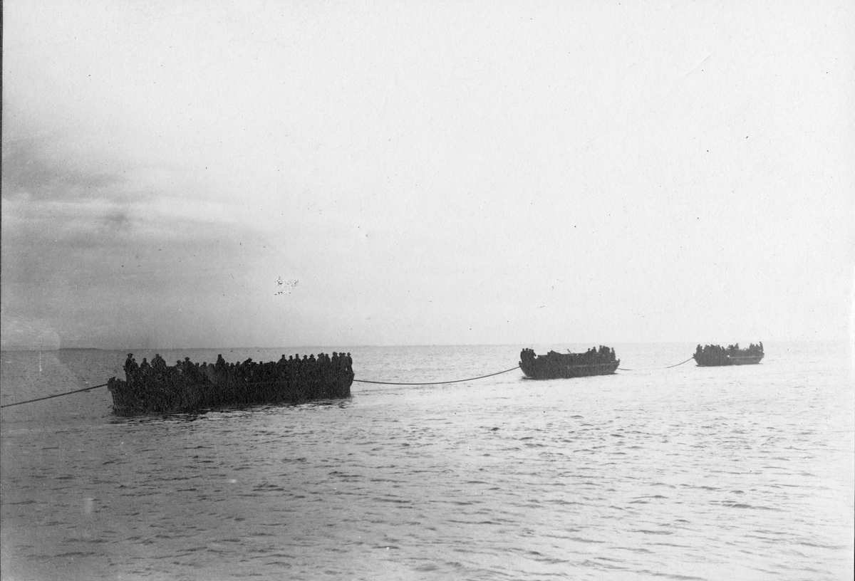 Titel: Bogsering av tre pråmar fulla med manskap på öppet vatten.