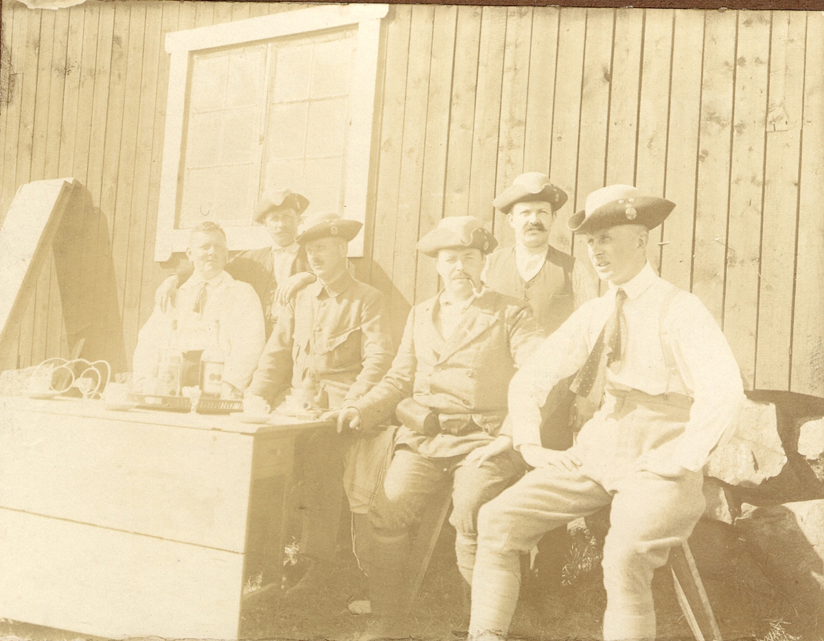 Män i Landstormsuniform sitter på en bänk framför en träbyggnad i Löttinge, Täby, 1914. På bordet framför står flaskor och koppar.
