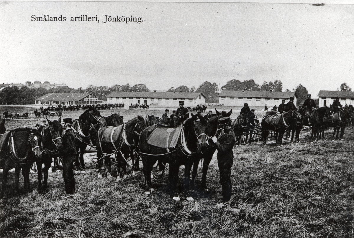 Smålands artilleri regemente A 6, Jönköping anspända hästar i förgrund och bakgrund, stallar och andra regementslokaler.