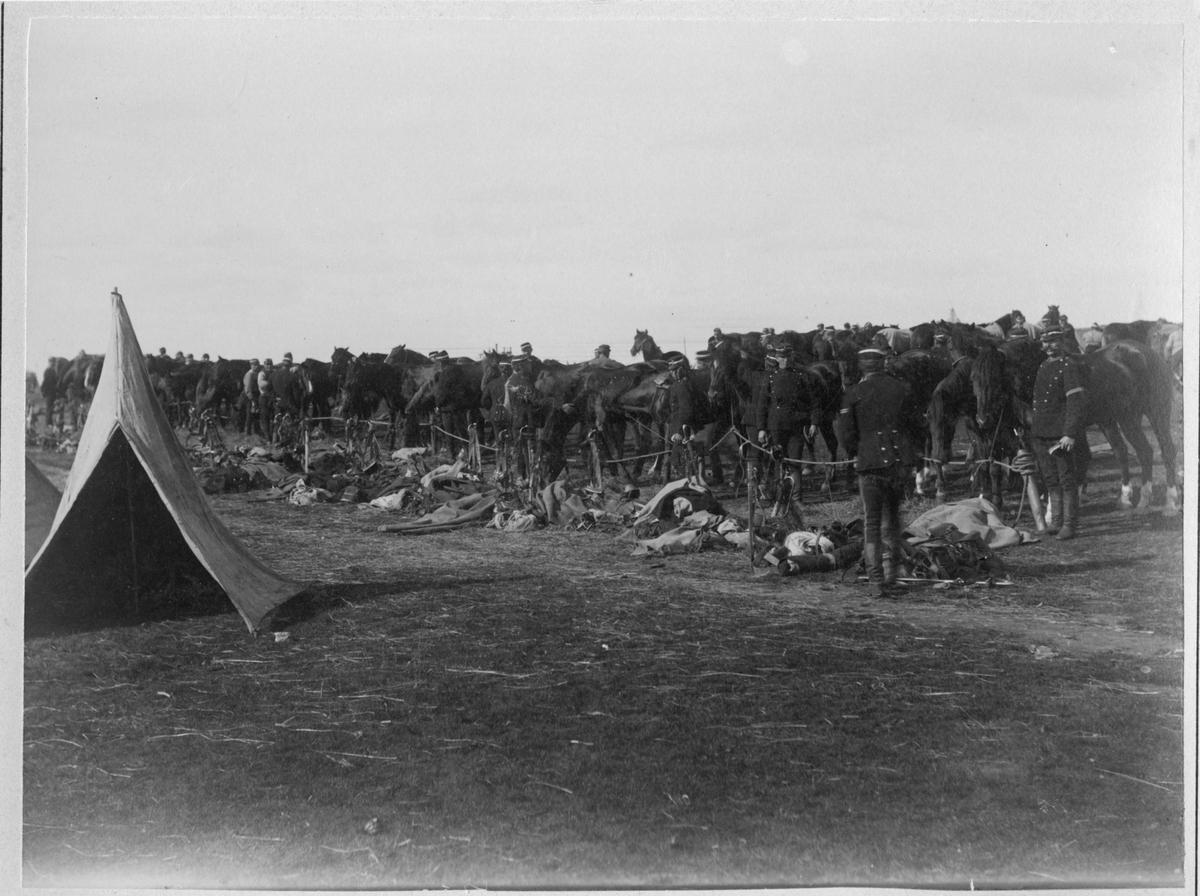 Skånska dragonregementet K 6, Malmö skvadron i bivack. I bakgrunden står hästar på linje med sadlar och packning på marken.