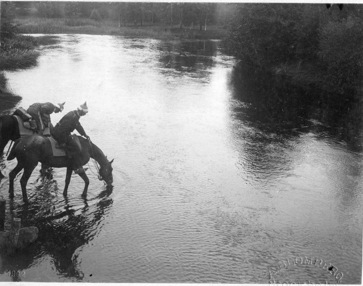 Två ryttare från Livregementet till Häst, K 1, vattnar sina hästar vid Spångeån.