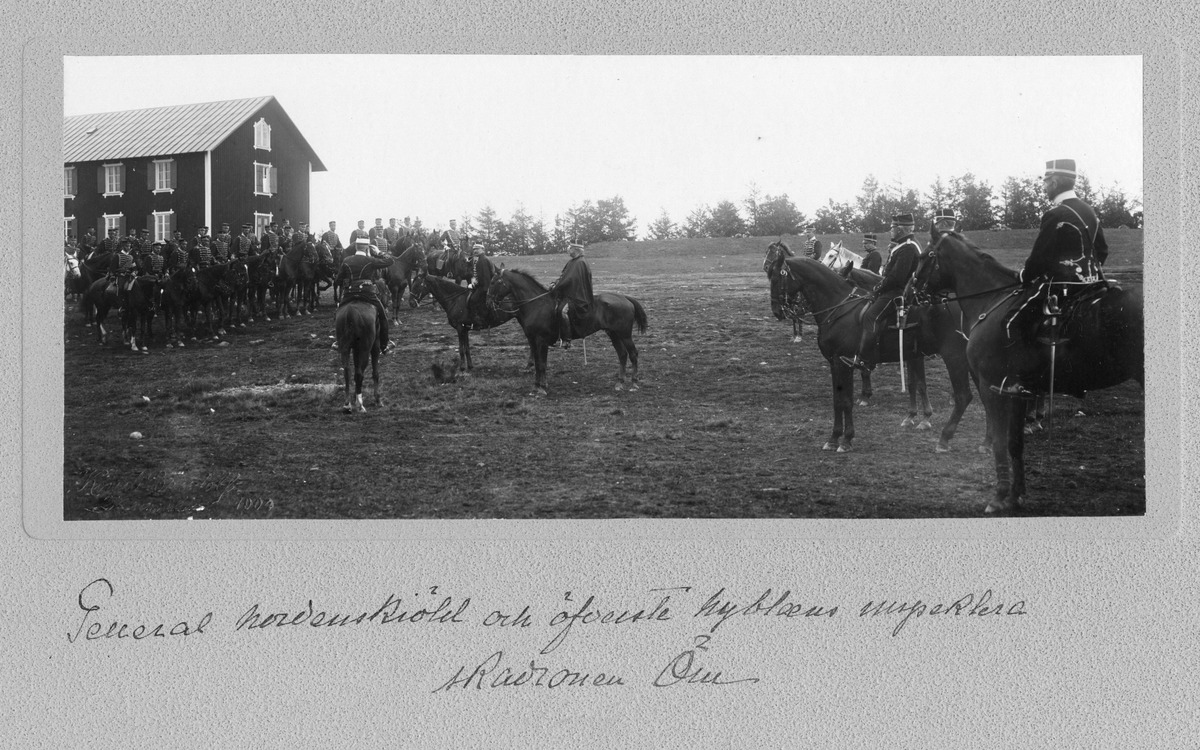 General Nordenskjöld och överste Nyblaeus inspekterar en beriden trupp ur Livregementets husarer K 3.