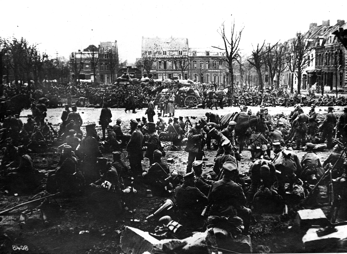Titel: Första världskriget: Tyskt infanteri under rast på torget i Armentiéres.