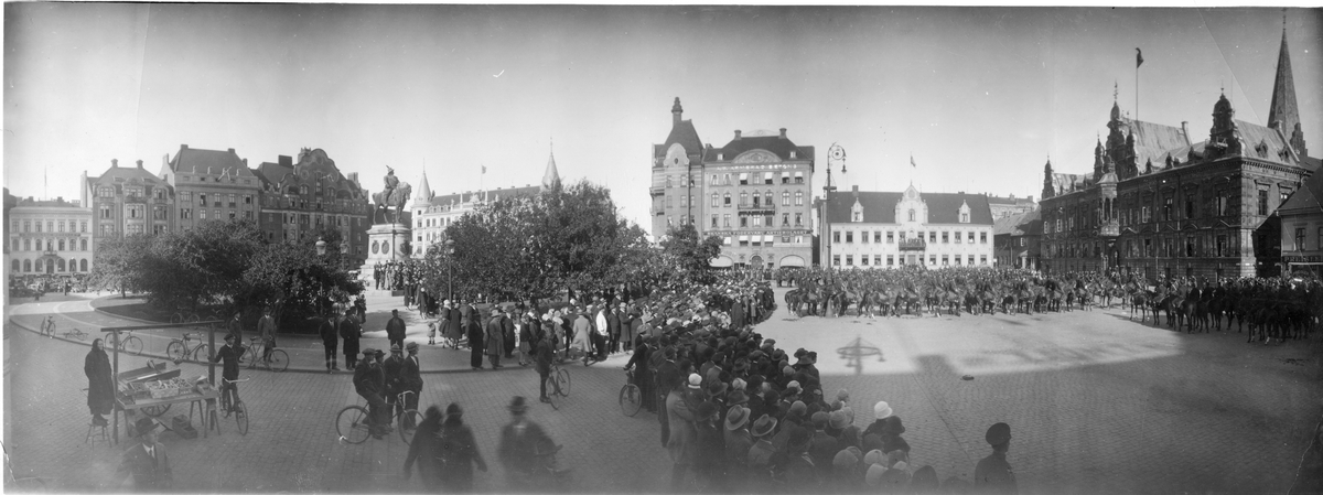 Titel: Kronprinsens husarer K 7 paraderar på torg i Malmö 1927.