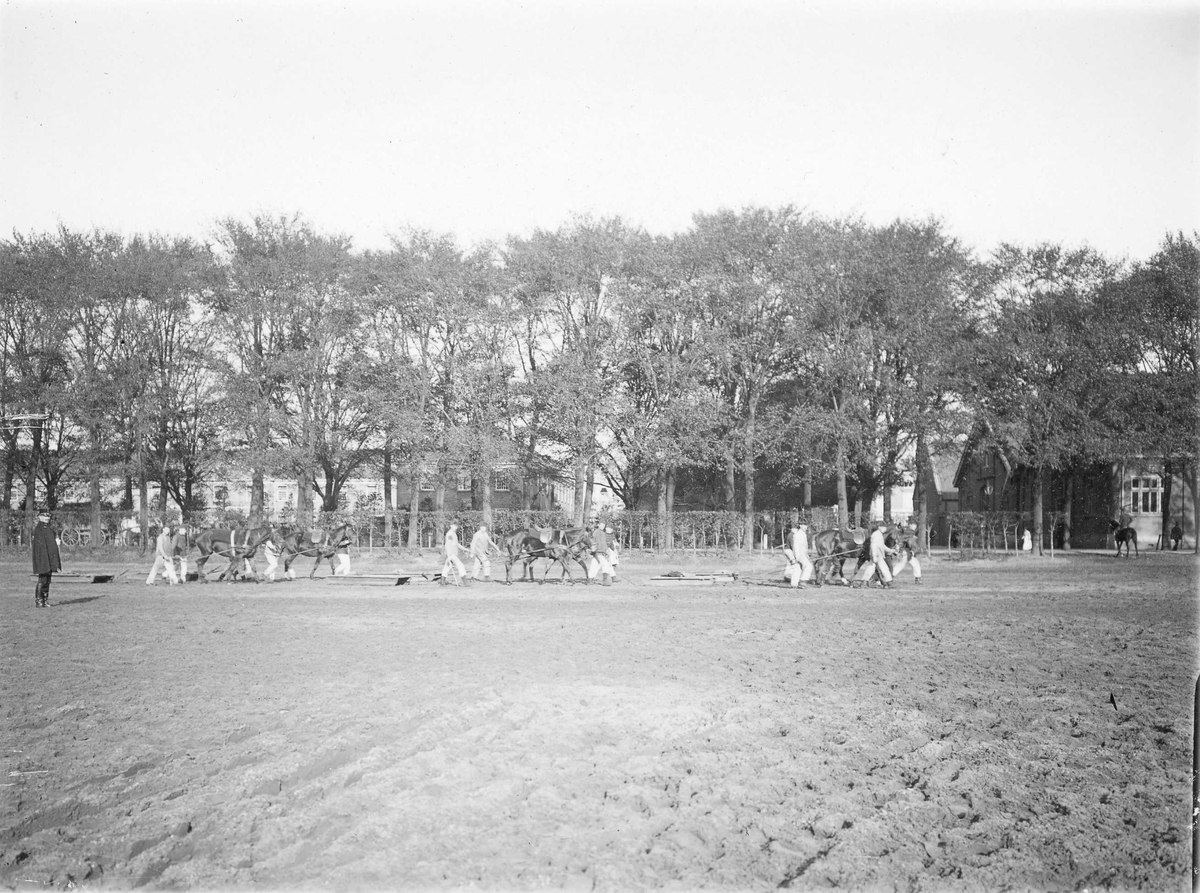 Stallpersonal i arbetskläder leder hästar över gård, okänt förband.
