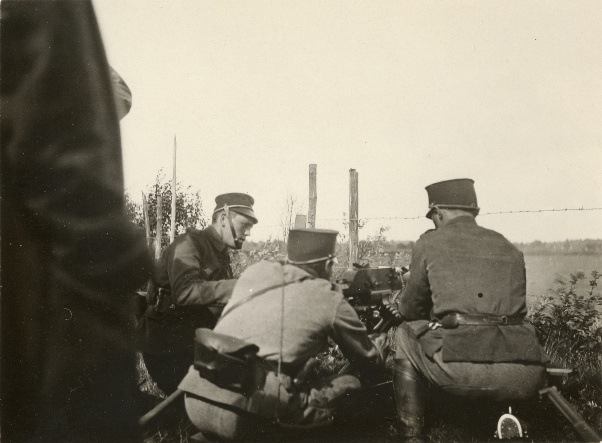 Titel: Soldater från Livregementets husarer K 3 med kulspruta vid ett taggtrådsstängsel.