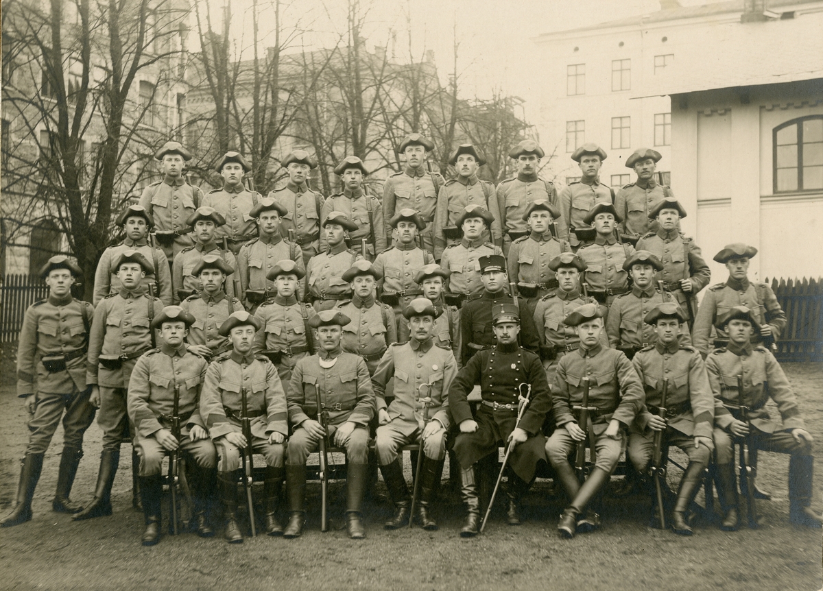 Grupporträtt av soldater och officerare vid Rekrytskolan, Positionsartilleriregementet A 9, 1913.