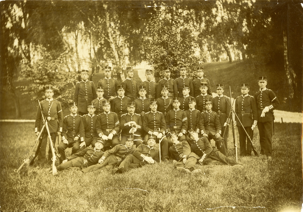 Titel: Grupporträtt av officerare och soldater vid Rekrytskolan 1898.
