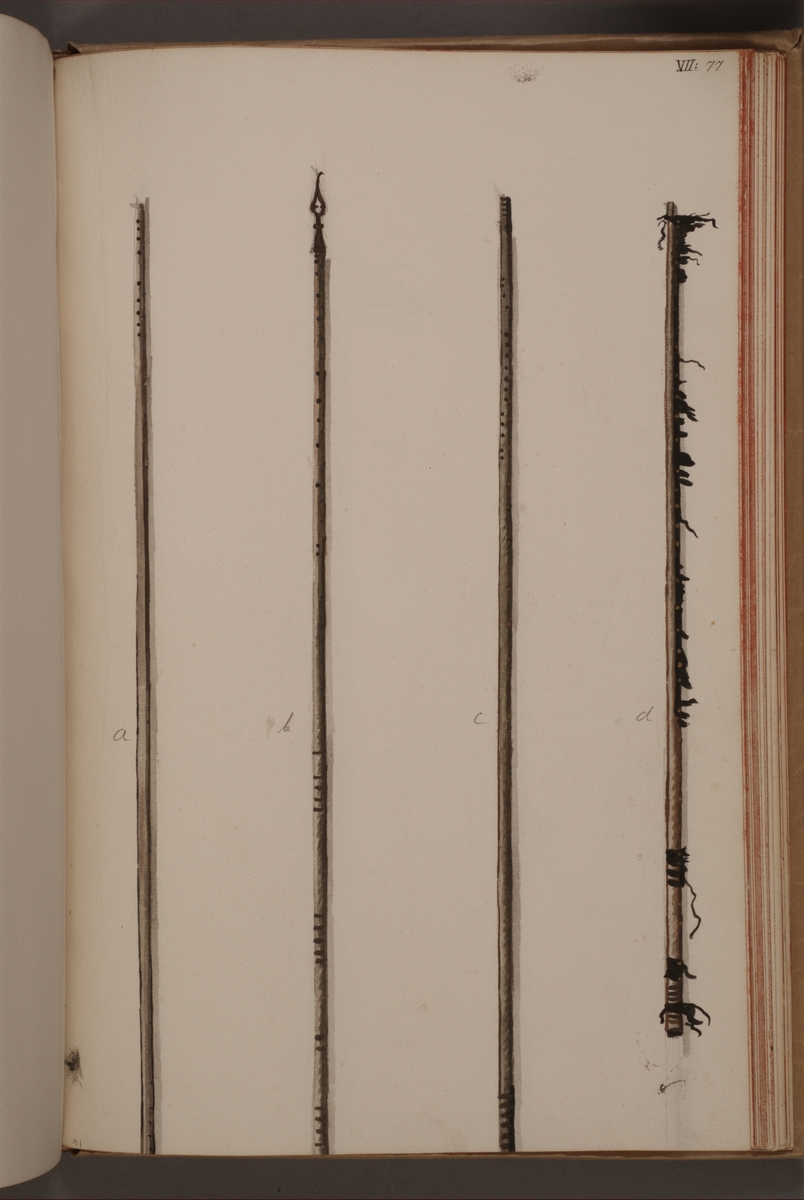 Avbildning i gouache föreställande fanstänger tagna som troféer av svenska armén. Stången längst till höger i bild finns bevarad i Armémuseums samling, för mer information, se relaterade objekt.