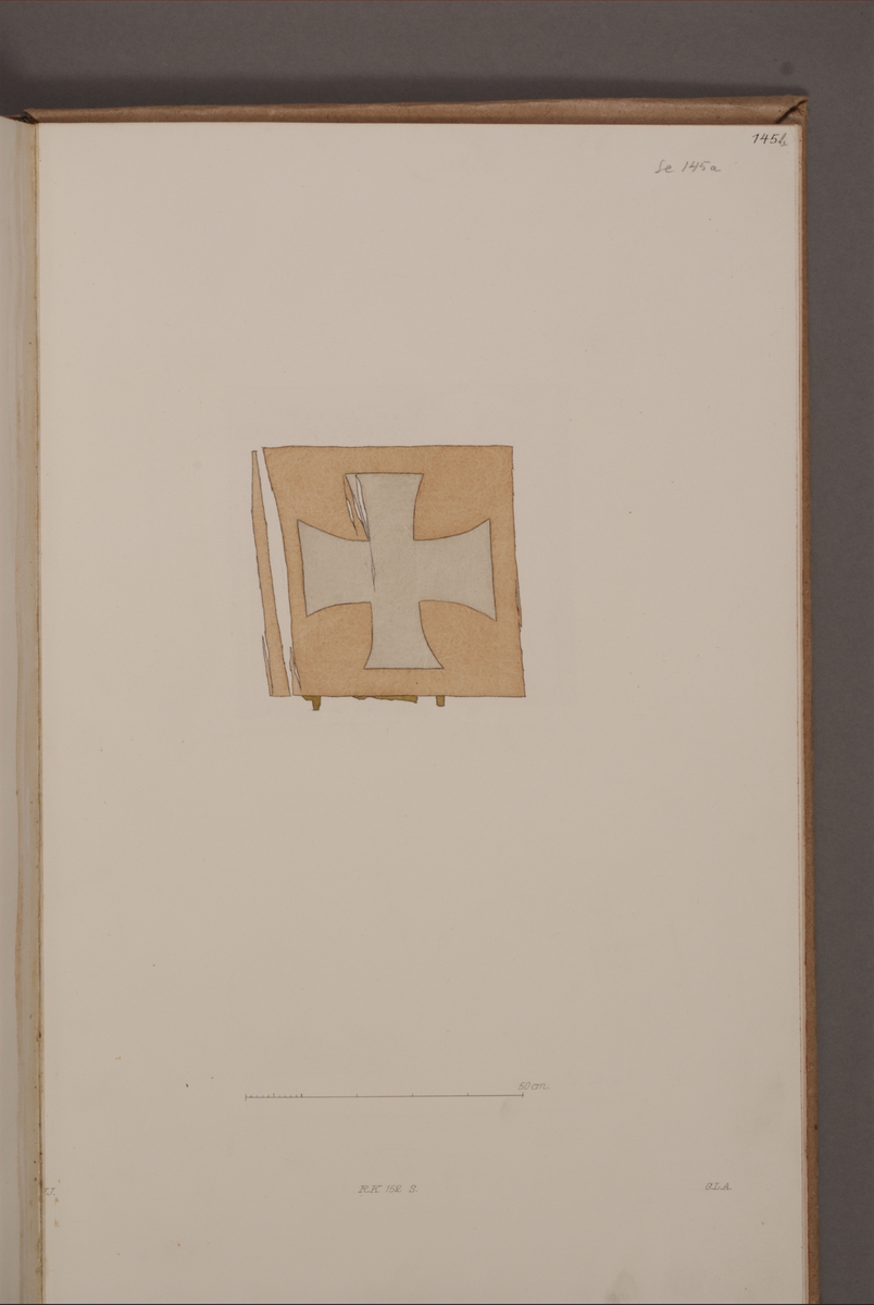 Avbildning i gouache föreställande detalj av fälttecken taget som trofé av svenska armén. Den avbildade fanan finns inte bevarad i Armémuseums samling.
