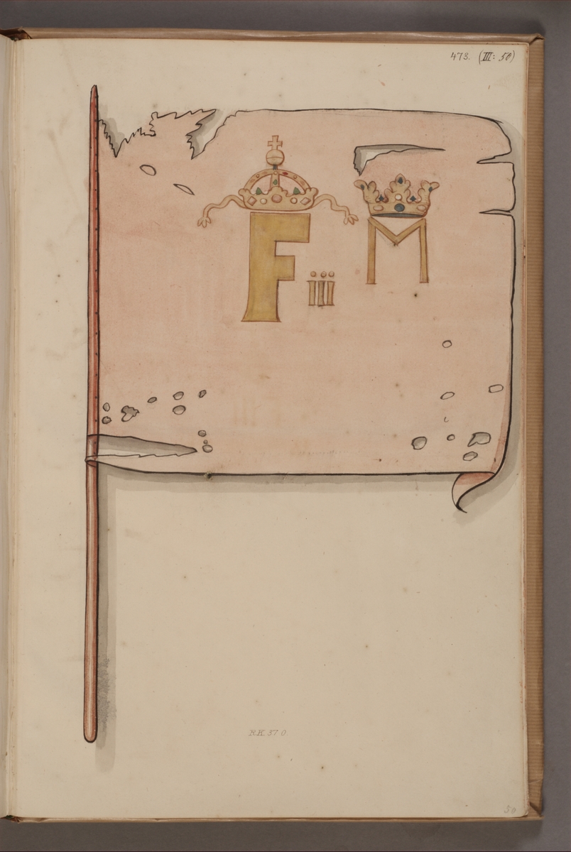 Avbildning i gouache föreställande fana tagen som trofé av svenska armén. Den avbildade fanan finns bevarad i Armémuseums samling, för mer information, se relaterade objekt.
