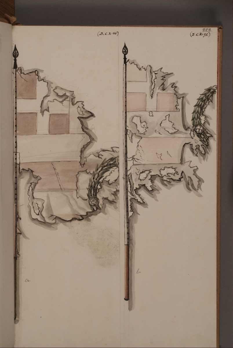 Avbildning i gouache föreställande fälttecken tagna som troféer av svenska armén. De avbildade fanorna finns inte bevarade i Armémuseums samling.