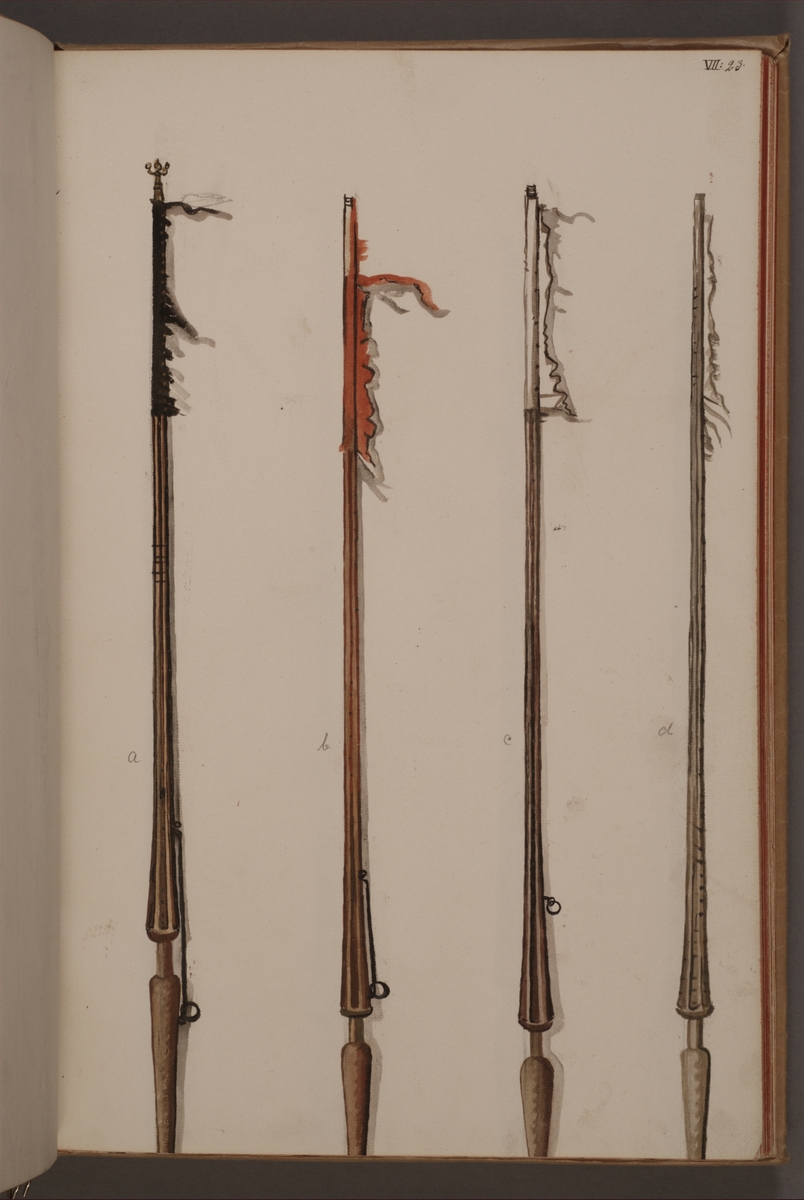 Avbildning i gouache föreställande standarstänger tagna som troféer av svenska armén. Stängerna längst till vänster och längst till höger i bild finns bevarade i Armémuseums samling, för mer information, se relaterade objekt.