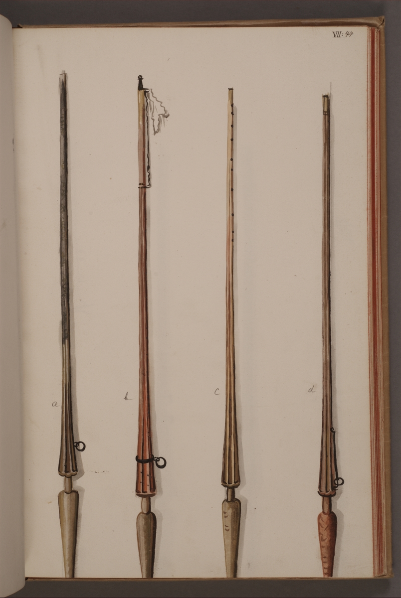 Avbildning i gouache föreställande standarstänger tagna som troféer av svenska armén. Stängerna längst till höger och längst till vänster finns bevarade i Armémuseums samling, för mer information, se relaterade objekt.