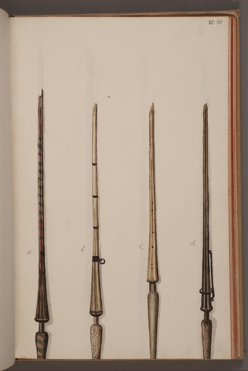Avbildning i gouache föreställande standarstänger tagna som troféer av svenska armén. De tre stängerna längst till vänster i bild finns bevarade i Armémuseums samling, för mer information, se relaterade objekt.