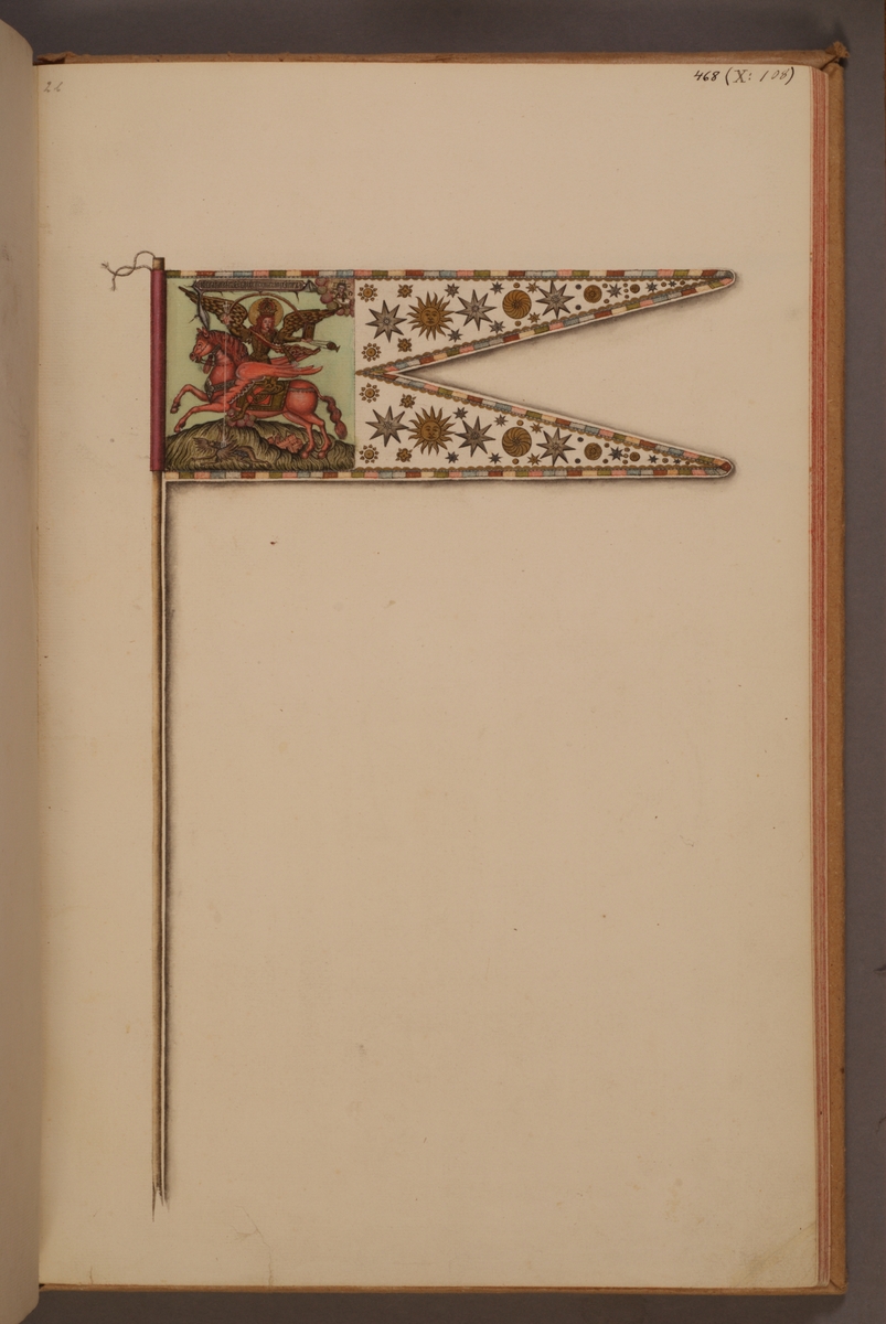 Avbildning i gouache föreställande fälttecken taget som trofé av svenska armén. Den avbildade lansfanan finns inte bevarad i Armémuseums samling.