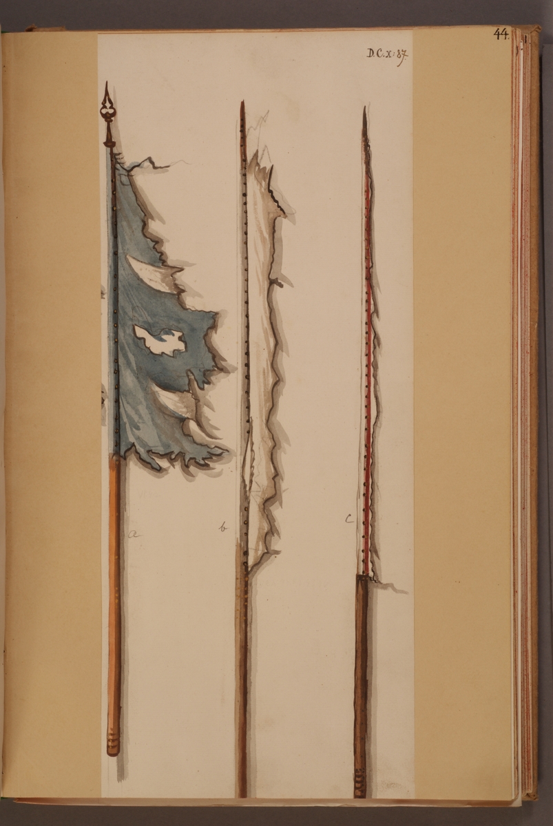 Avbildning i gouache föreställande fälttecken tagna som troféer av svenska armén. De avbildade danorna finns inte bevarade i Armémuseums samling.