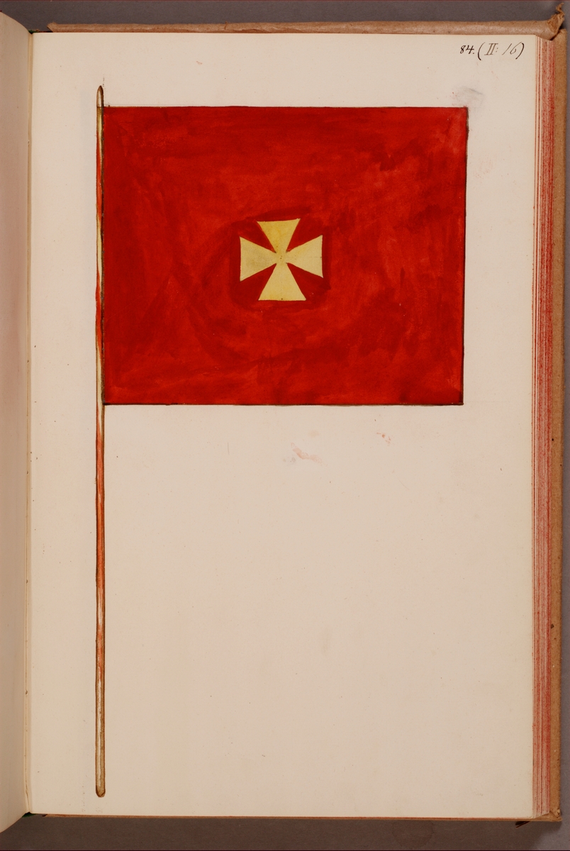 Titel: Avbildning i gouache föreställande fälttecken taget som trofé av svenska armén. Den avbildade fanan finns inte bevarad i Armémuseums samling.