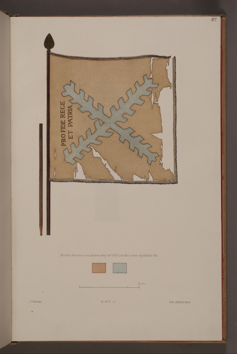 Titel: Avbildning i gouache föreställande fälttecken taget som trofé av svenska armén. Den avbildade fanan finns bevarad i Armémuseums samling, för mer information, se relaterade objekt.