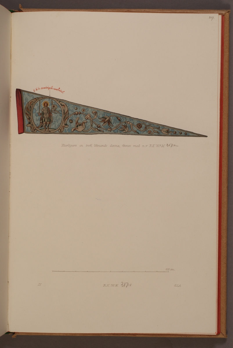 Avbildning i gouache föreställande fälttecken taget som trofé av svenska armén. Den avbildade vimpeln finns bevarad i Armémuseums samling, för mer information, se relaterade objekt.