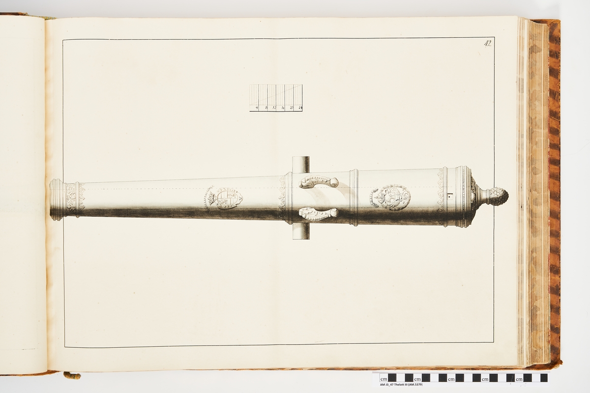 Avbildning föreställande romersk kejserlig trofé med kejsar Ferdinand III:s vapen. Ingår i volym med avbildade äldre svenska eldrör förvarade på fästningar samt eldrör erövrade åren 1598-1679.