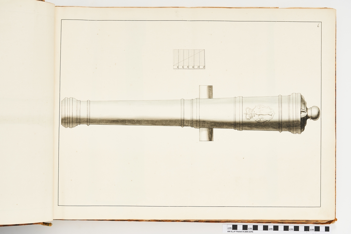 Avbildning föreställande gammalt svenskt metallstycke som legat på rikets fästningar, med Vasaättens vapen. Ingår i volym med avbildade äldre svenska eldrör förvarade på fästningar samt eldrör erövrade åren 1598-1679.