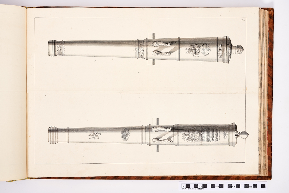 Avbildning föreställande eldrör tagna som troféer av den svenska armén vid Jakobstadt den 20 juli 1704 under general Adam Leijonhufvuds (Lewnhaupt) anförande. Ingår i volym med avbildade kanontroféer tagna åren 1703-1706.