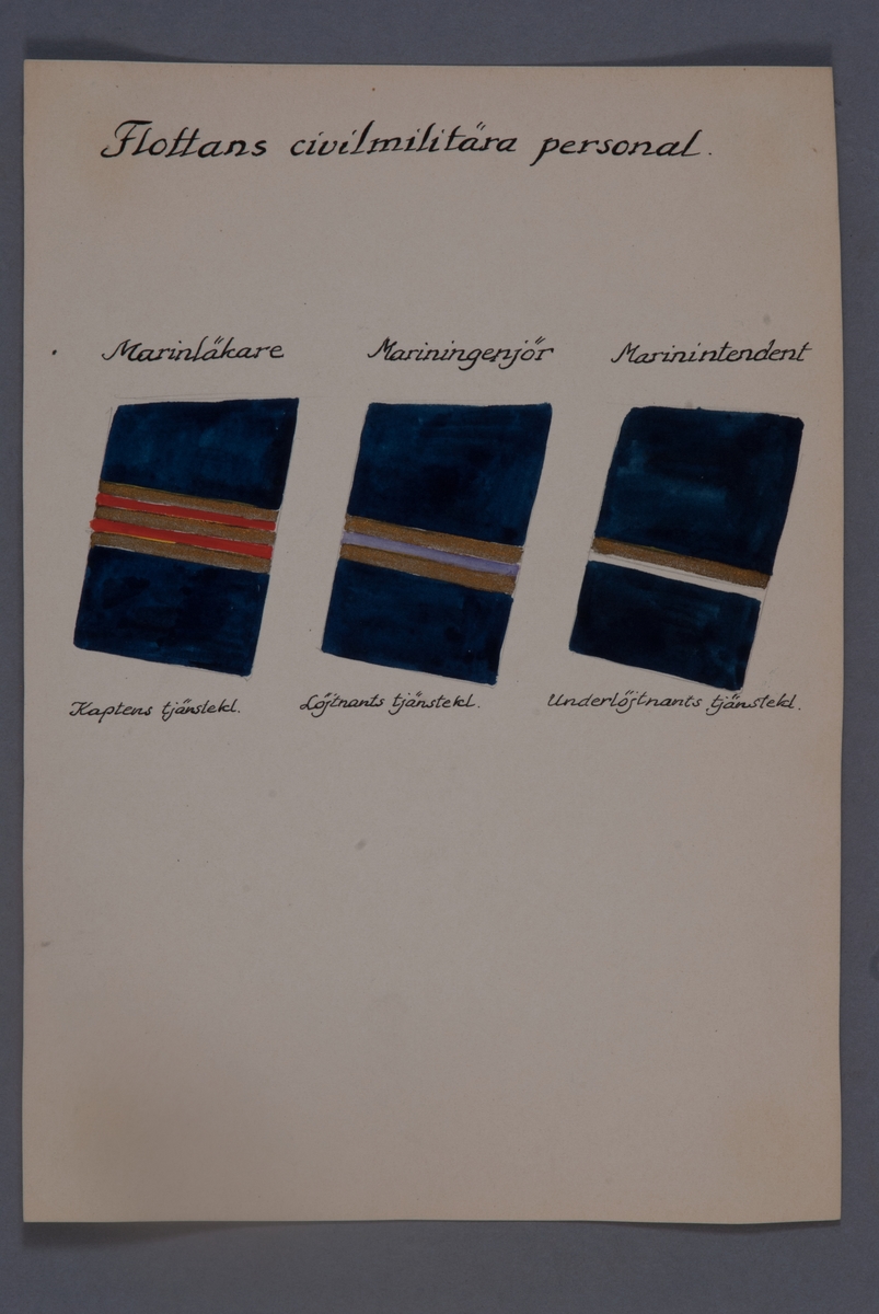 Teckning i original av Einar von Strokirch, med gradbeteckning för flottans civilmilitära personal.