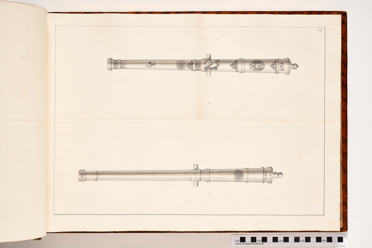 Titel: Avbildning föreställande eldrör tagna som troféer av den svenska armén i Polen den 4 oktober 1703 och utur staden Strasburg (Brodnica) den 16 oktober 1703. Ingår i volym med avbildade kanontroféer tagna åren 1703-1706.