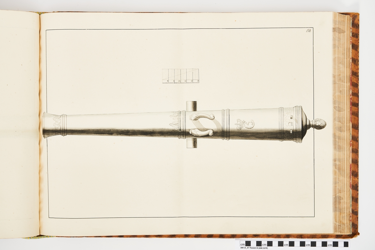 Avbildning föreställande dansk trofé med Kristian V:s vapen. Ingår i volym med avbildade äldre svenska eldrör förvarade på fästningar samt eldrör erövrade åren 1598-1679.