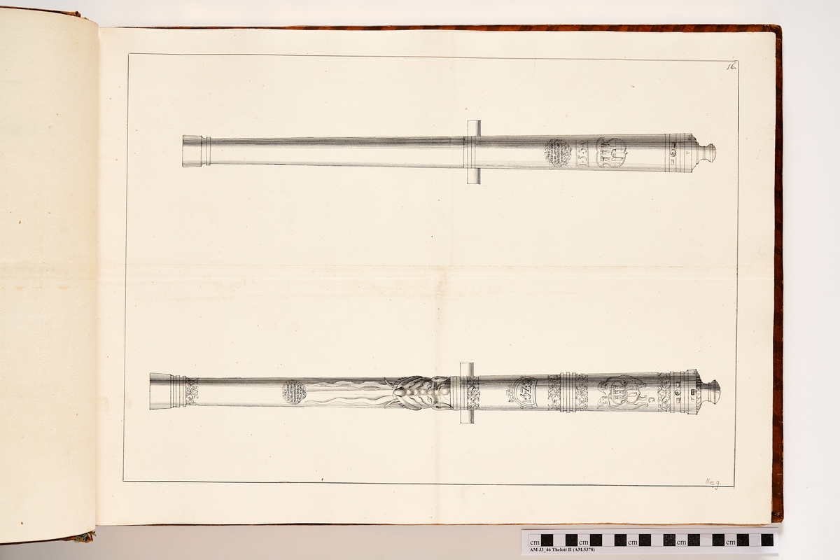 Avbildning föreställande eldrör tagna som troféer av den svenska armén med fästningen Torn den 4 oktober 1703. Ingår i volym med avbildade kanontroféer tagna åren 1703-1706.