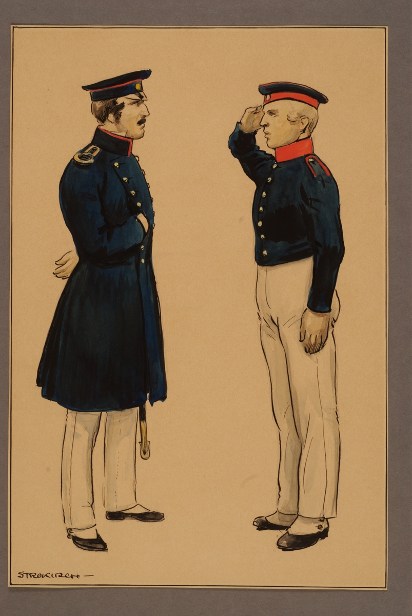Plansch med uniform för officer och menig vid Västgöta regemente 1830-tal, ritad av Einar von Strokirch.