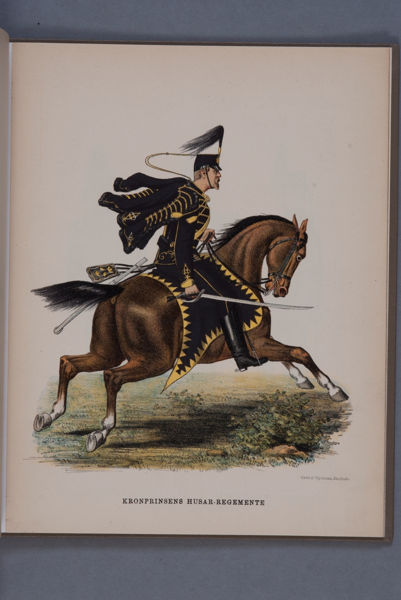 Plansch i färgtryck med uniform för Kronprinsens husarregemente. Ingår i boken Svenska arméns och flottans uniformer, utgiven av P.B Eklund 1891.