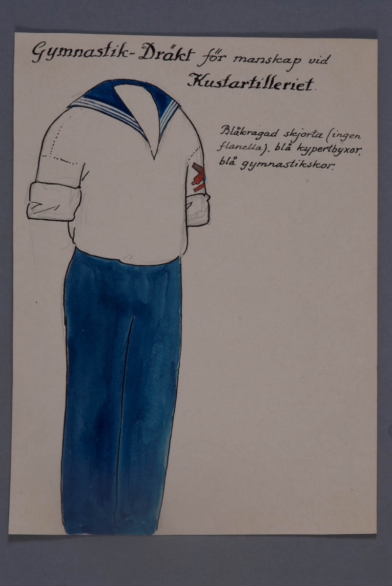 Uniformsteckning i original av Einar von Strokirch, gymnastikdräkt för manskap vid Kustartilleriet.