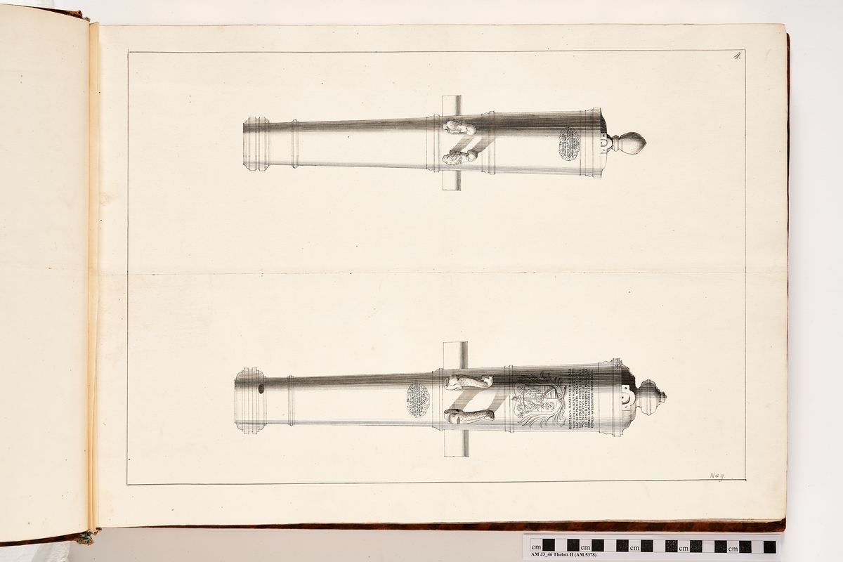Avbildning föreställande eldrör tagna som troféer av den svenska armén i slaget vid Saladen den 19 mars 1703. Ingår i volym med avbildade kanontroféer tagna åren 1703-1706.